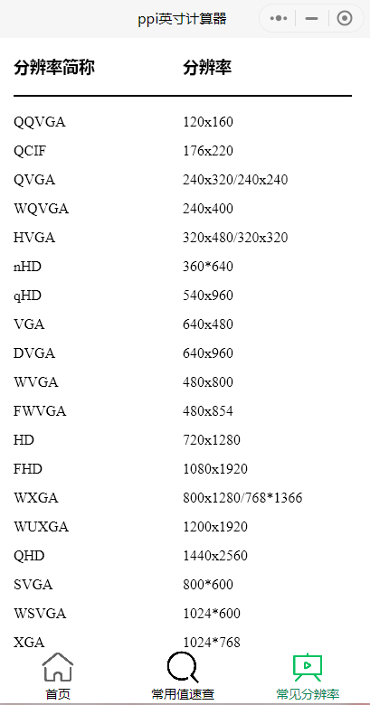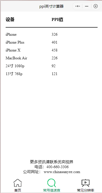 当您想知道显示屏的PPI,是否满足Retina标准;当您想了解分辨率缩写与具体数值的对应关系时;请打开优奕视界专业定制小程序APP,随用随开,极度方便值得您收藏与拥有!