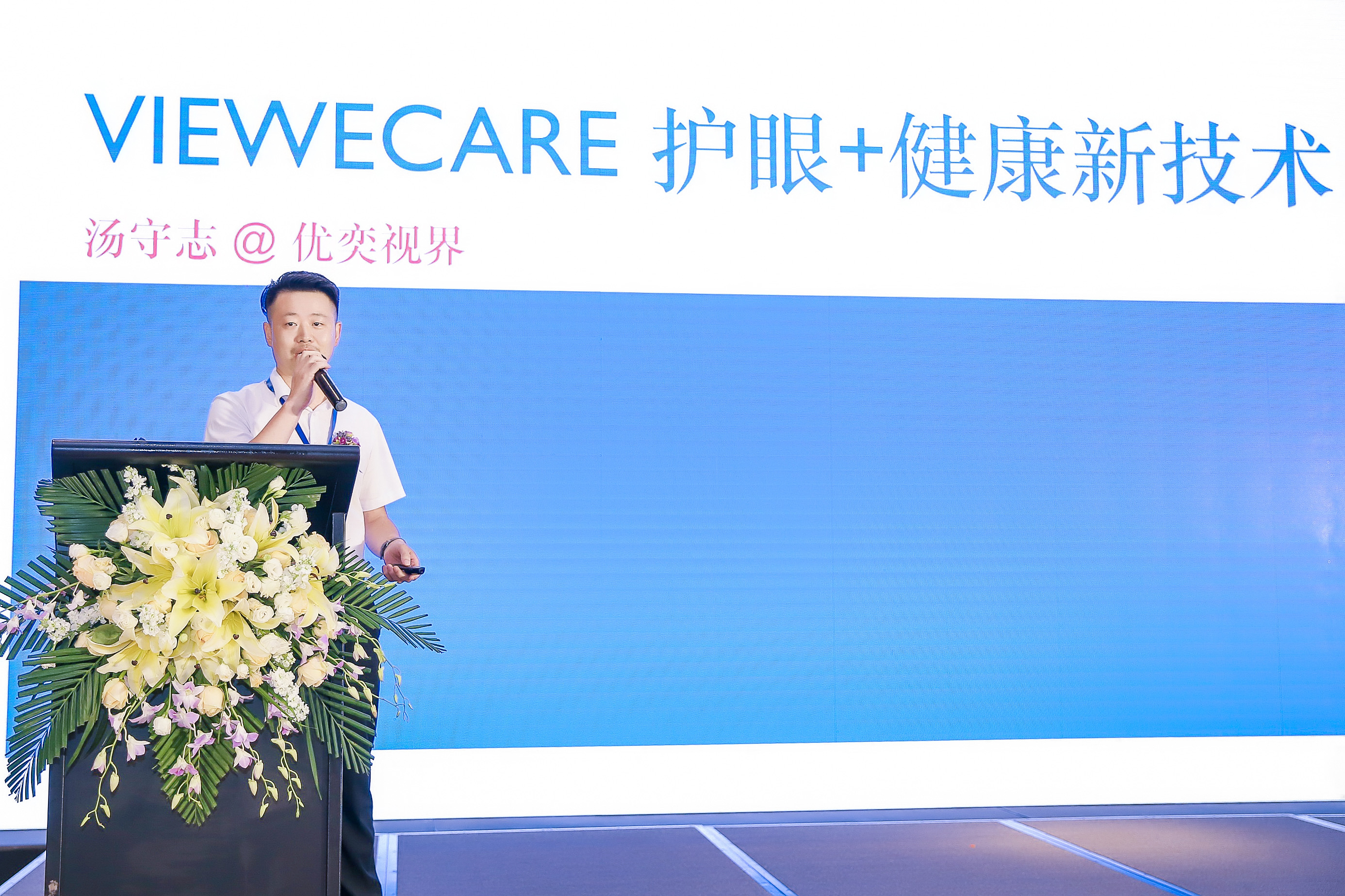 优奕视界总经理汤守志向大会介绍了他们的新一代VIEWECARE显示技术:目之所及需要护眼,手之所触需要无菌健康。现在消费者和儿童面对显示屏的时间越来越长,对眼睛造成伤害,他们通过技术创新推出的新产品,可以有效过滤90%对儿童眼睛造成伤害的有害蓝光。同时,他们产品的抗菌能力也处于行业领先,能够消除99.9%的广谱细菌,打造一个真正无菌健康的电子产品。